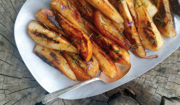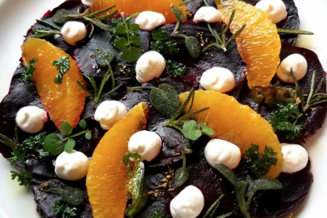 Preheat an oven to 400°. Wrap the oil drizzled, salt and pepper sprinkled beets and cannabis buds in foil packets. Seal up nicely. Place the bundles on a baking sheet. Roast in a 400° oven for about an hour. When cool, use a paper towel to rub off the beet skins. (dry + keep the purple buds for another application) Slice the beets into large thin rounds. Place in a big casserole and drizzle the slices with a couple of tbsp’s of the vinaigrette to marinade for 15-20 minutes before serving.